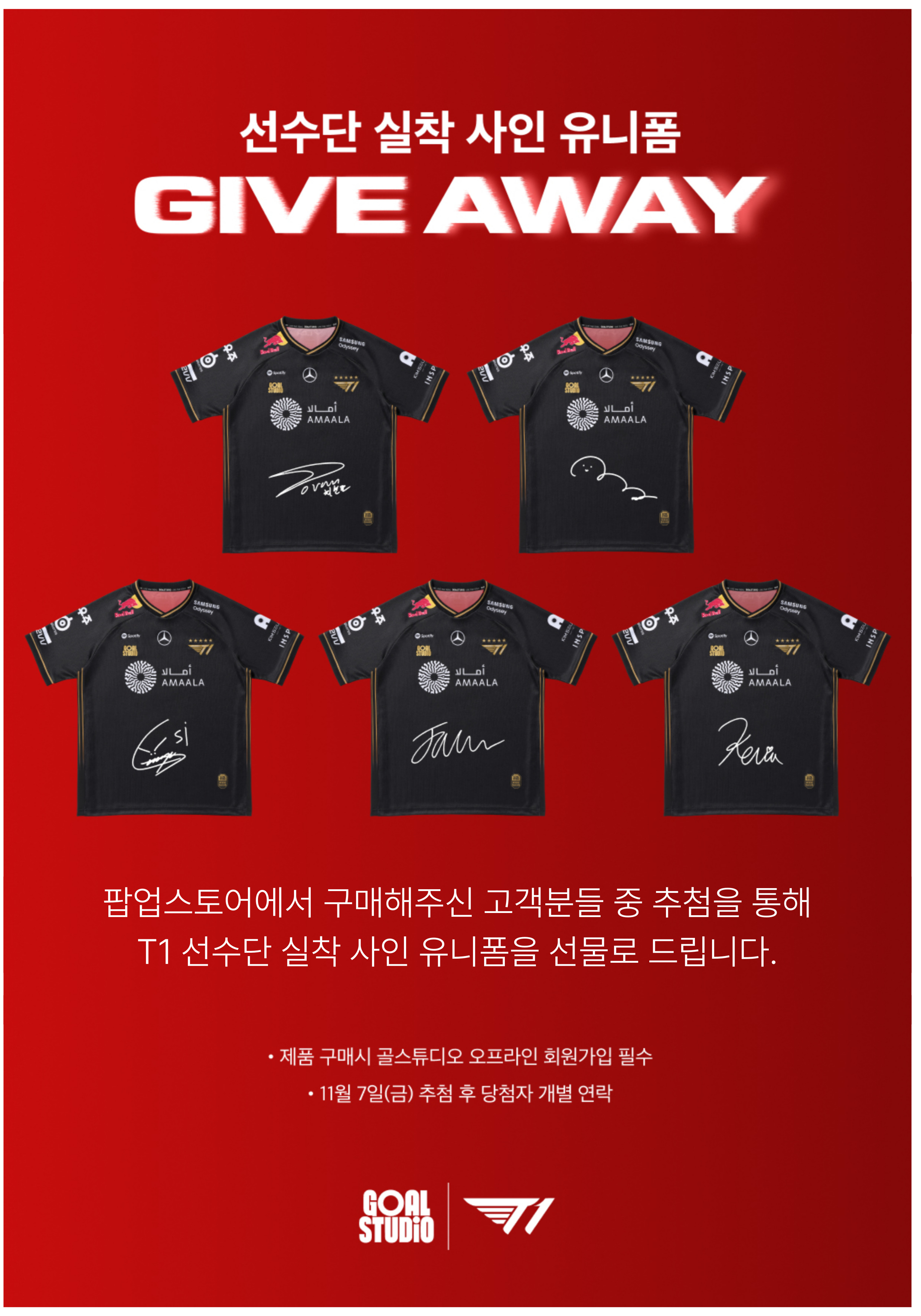 모든 구매 고객 중 T1 선수단 실착 사인 유니폼 1개 추첨 증정